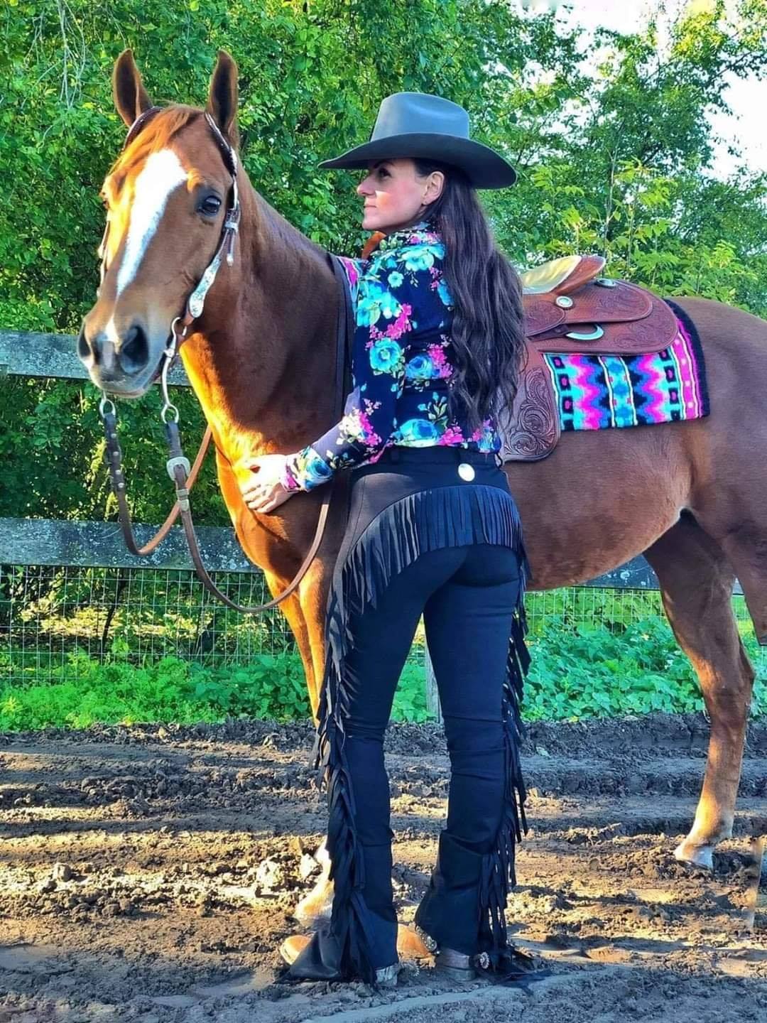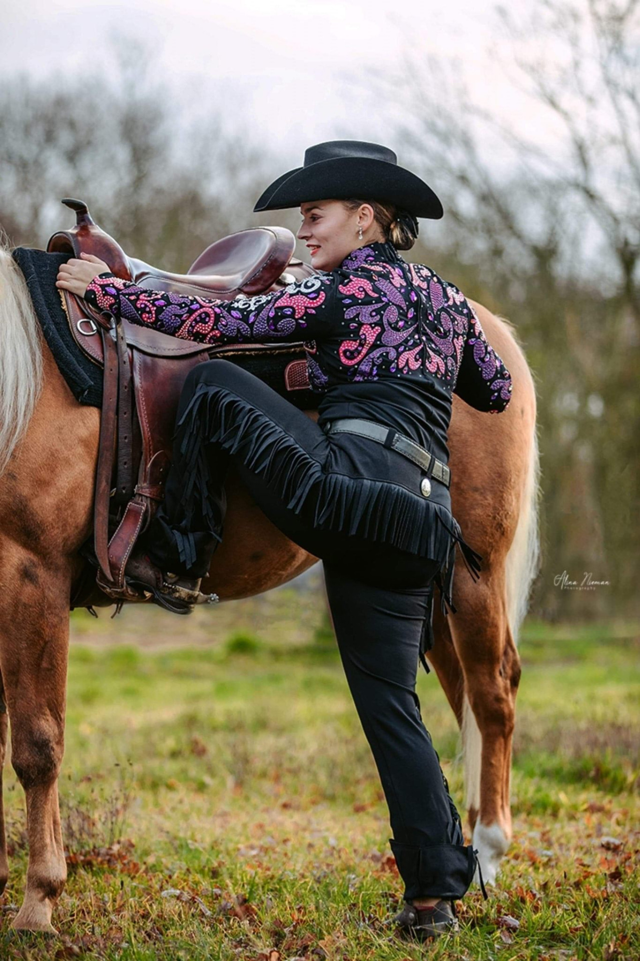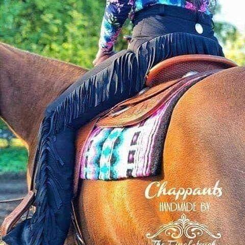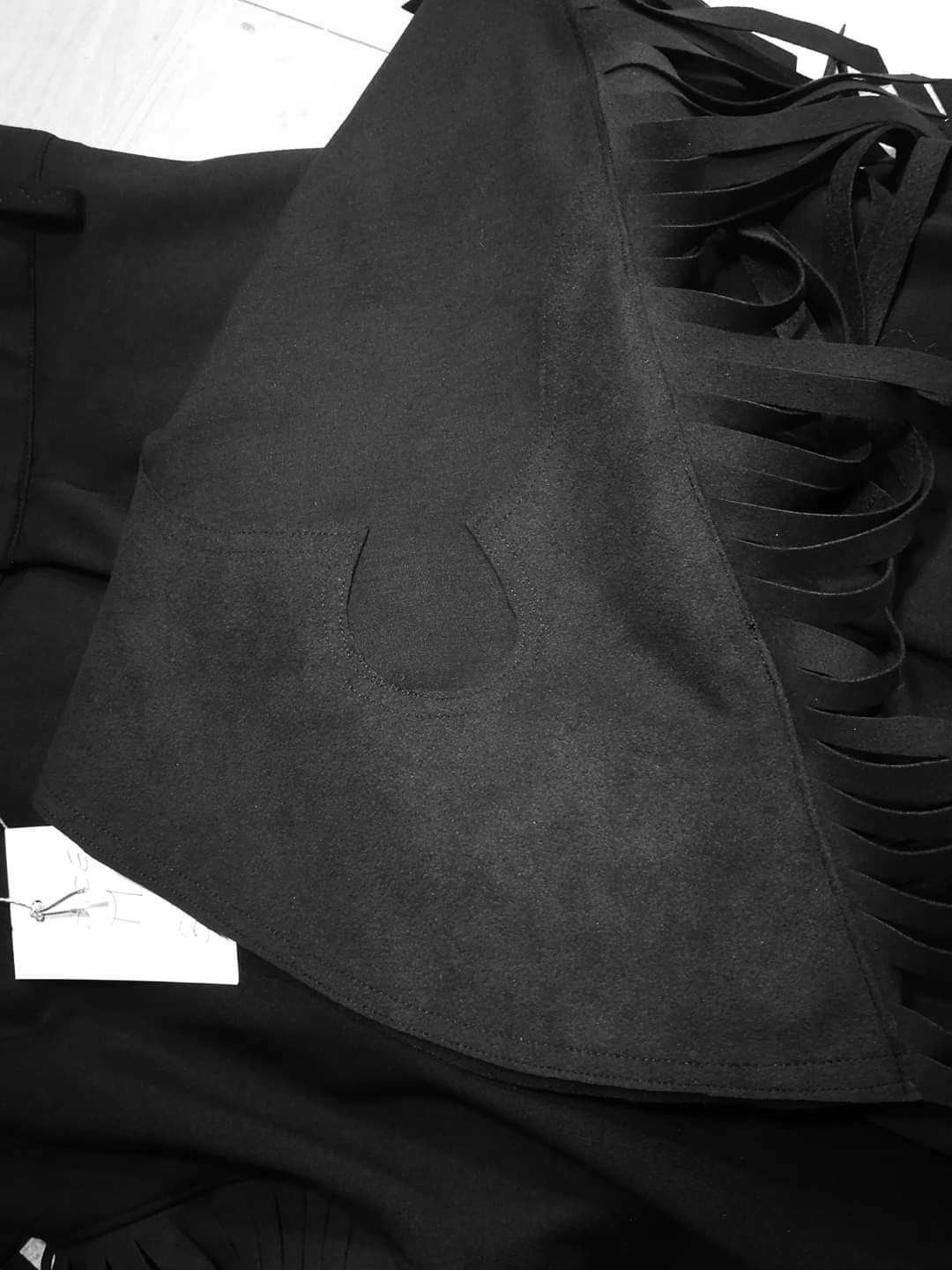 Black heavy stretch fabric with ultrasuede fringes Concho with swarovski crystals Size M: AB 86, hip 100, upper leg 56, knee 40, innerseam 80 AB 33,5", hip 39", upper leg 22", knee 15,5", innerseam 31,5"